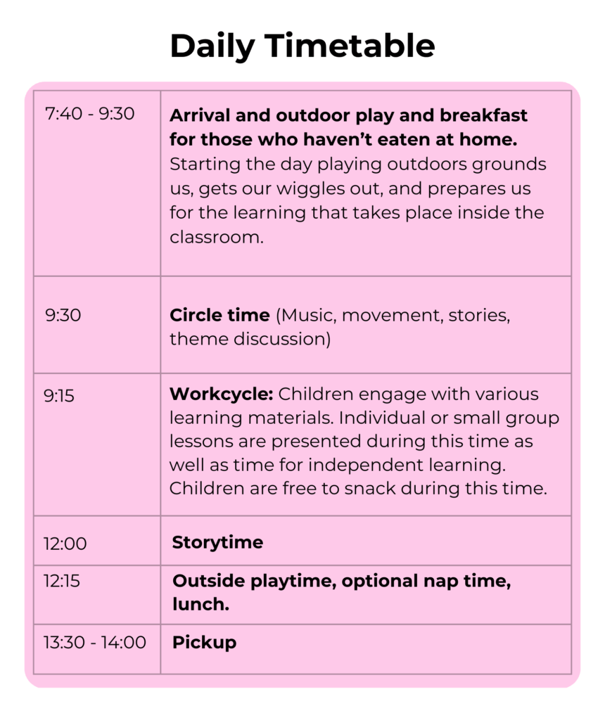 Our approach focuses on fostering independence, self-directed learning, and the holistic development of each child. This means creating a home-like environment where children can feel free to be themselves. We encourage and make time for outdoor play. It is integral, not only to healthy development but to forming a sense of belonging in our world and our responsibility to look after it. Our goal is to create a nurturing environment that encourages children to explore, discover, and