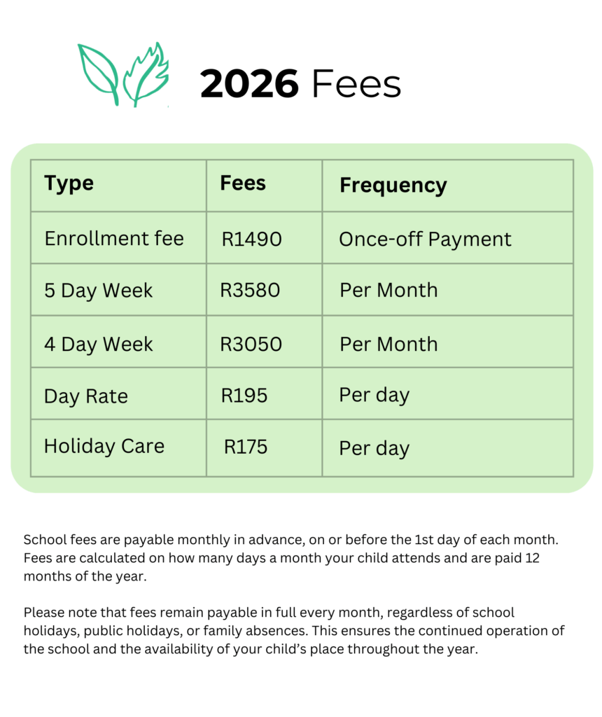 We cater for children between 2 and 6 years old (including Grade R), depending on each child's readiness. We have one mixed age class where children of all ages can learn from one another. We prioritize the power of meaningful human connection, so we keep our class size small. We ensure that every child receives the attention, care, and quality education they deserve, cultivating a sense of belonging within our community.
